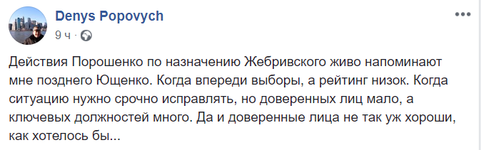 "Действия Порошенко по назначению Жебривского живо напоминают мне позднего Ющенко. Когда впереди выборы, а рейтинг низок. Когда ситуацию нужно срочно исправлять, но доверенных лиц мало, а ключевых должностей много. Да и доверенные лица не так уж хороши, как хотелось бы...".
