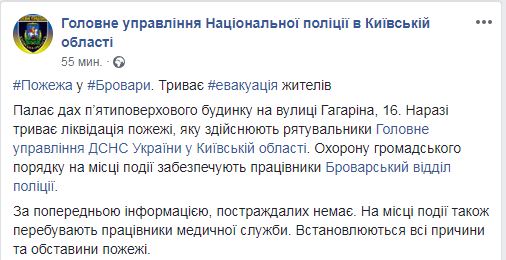 "Пылает крыша пятиэтажного дома на улице Гагарина, 16. Сейчас продолжается ликвидация пожара. Охрану общественного порядка на месте происшествия обеспечивают работники Броварского отдела полиции", – говорится в сообщении.