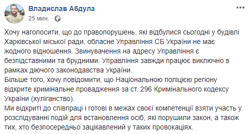 Управление СБУ в Харьковской области заявило о своей непричастности к беспорядкам, которые произошли утром в среду, 20 июня, в горсовете Харькова. Об этом на своей странице в Facebook написал начальник пресс-центра облуправления Службы безопасности Владислав Абдула.
