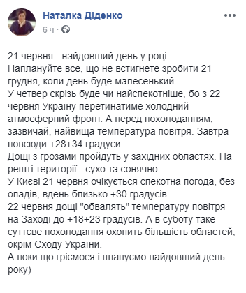 Четверг, 21 июня, День летнего сонцестояния будет очень жарким. Об этом на своей странице в Facebook сообщает синоптик Наталка Диденко.