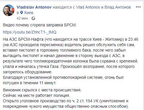 "На АЗС БРСМ-Нафта (что находится на трассе Киев - Житомир) в 23:46 (на АЗС проходила пересменка) водитель решил обслужить себя сам, вставил пистолет в горловину топливного бака, после чего забыл вытащить пистолет и начал движение в сторону выезда с АЗС, в результате чего топливораздаточная колонка была сорвана с крепежей, упала и началась утечка газа", - написал Антонов.