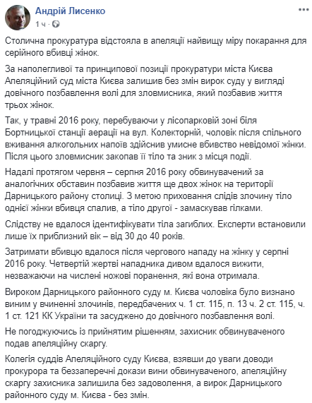 "Приговором Дарницкого районного суда г. Киева мужчина был признан виновным в совершении преступлений, предусмотренных ч. 1 ст. 115, п. 13 ч. 2 ст. 115, ч. 1 ст. 121 УК Украины и приговорен к пожизненному лишению свободы. Не соглашаясь с принятым решением, защитник обвиняемого подал апелляционную жалобу", - написал в соцсети Андрей Лысенко.