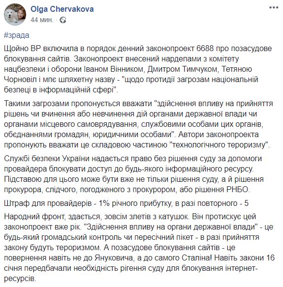 "Народный фронт, кажется, совсем слетел с катушек. Он прожимают этот законопроект уже год. "Осуществление влияния на органы государственной власти" - это любой общественный контроль или рядовой пикет - в случае принятия закона будут терроризмом. А внесудебное блокирование сайтов - это возвращение даже не к Януковичу, а к самому Сталину! Даже законы 16 января предусматривали необходимость решения суда для блокировки интернет-ресурсов", - пишет Червакова.