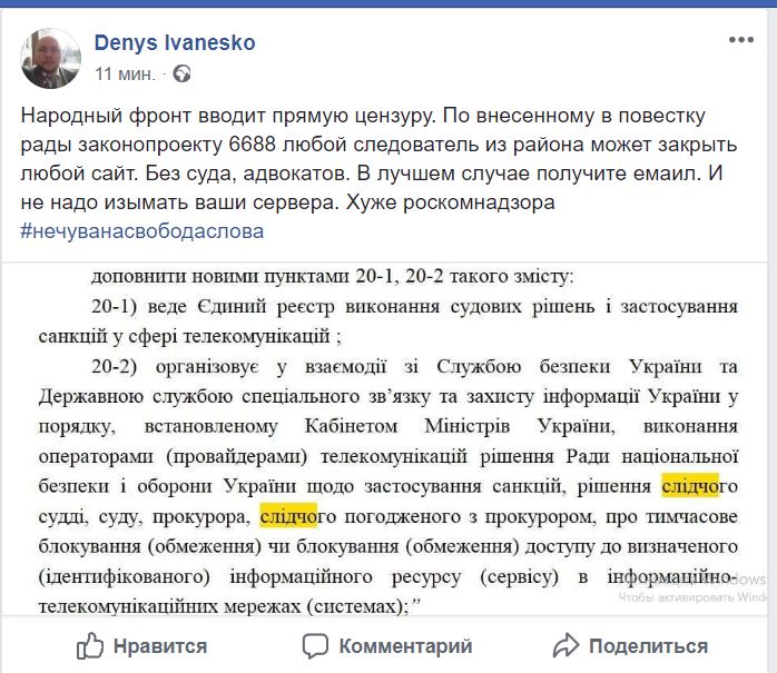 "Народный фронт вводит прямую цензуру. По внесенному в повестку рады законопроекту 6688 любой следователь из района может закрыть любой сайт. Без суда, адвокатов. В лучшем случае получите емаил. И не надо изымать ваши сервера. Хуже роскомнадзора", - пишет Иванеско.