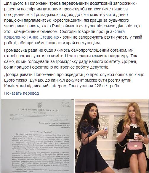 "Руководитель пресс-службы ВР Ирина Кармелюк сообщила, что изображенные на фото Юлия Махмуди и Валерия Егорова попадали в парламент как журналистки партийных изданий Радикальной партии Олега Ляшко – "Flash on Time News" и "Громадський вісник Києва", – сообщила Червакова.