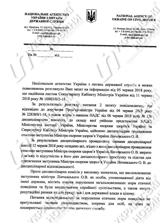 Дисциплинарная комиссия Нацагентства государственной службы нашла в скандальных высказываниях заместителя министра здравоохранения Александра Линчевского нарушение этических норм .