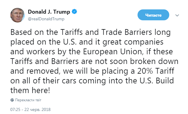 "Учитывая тарифы и торговые барьеры, введенные Европейским Союзом против США и наших компаний и работников, если эти тарифы в ближайшее время не будет снимут, мы введем 20% тарифы на их автомобили, ввозимые в США. Строим их здесь!", - написал он.