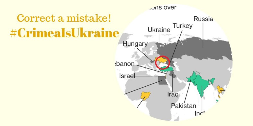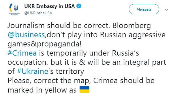 "В журналистике не должно быть ошибок. Агентству Bloomberg не стоит играть на руку агрессии и пропаганде Российской Федерации! Крым находится под временной оккупацией России, но он есть и будет неотъемлемой частью территории Украины. Пожалуйста, исправьте  на карте ошибку, Крым должен быть обозначен желтым цветом, как Украина", - отмечается на официальной странице.
