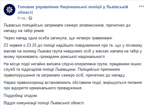 "23 июня в 23.25 в полицию поступило сообщение о том, что в лесном массиве на окраине Львова группа неизвестных лиц в масках напала на лагерь, в котором проживают граждане ромской национальности. На место происшествия немедленно выехала следственно-оперативная группа, работники других служб и подразделений полиции Львовщины. Полицейские прекратили правонарушения и задержали семь человек, причастных к нападению.