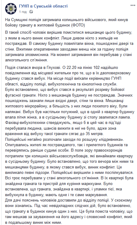 В Сумской области бывший военный взорвал боевую гранату в жилом доме. Об этом сообщает пресс-служба полиции региона в Facebook.