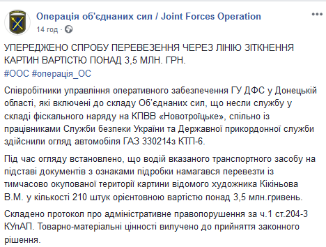 "При осмотре было установлено, что водитель указанного транспортного средства на основании документов с признаками подделки пытался перевезти с временно оккупированной территории картины известного художника Василия Кикинева в количестве 210 штук ориентировочной стоимостью более 3,5 млн. гривен", - уточнили в штабе ООС.
