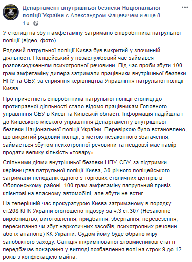 "Проверкой было установлено, что разоблаченный рядовой полиции, с целью незаконного обогащения, занимается сбытом психотропного вещества и вскоре намерен продать большое количество "товара". Совместными действиями внутренней безопасности НПУ, СБУ, при поддержке руководства патрульной полиции Киева, 30-летнего полицейского задержали возле одного из торговых столичных центров в Оболонском районе. 100 грамм амфетамина патрульный привез клиенту на собственном автомобиле, но сбыть не успел", - рассказали в пресс-службе.