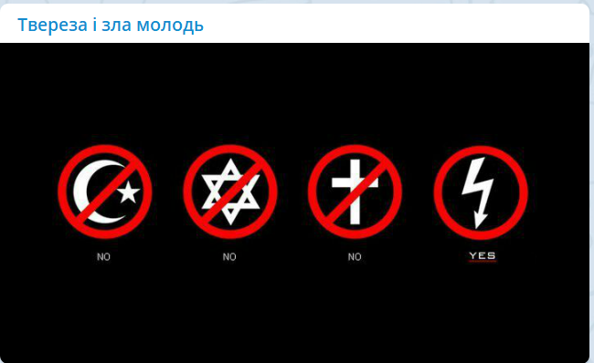 В Telegram-канале "Твереза і зла молодь" постятся картинки с антиисламским, юдофобским и антихристианским подтекстом. Состоят в этом паблике около 70 человек.