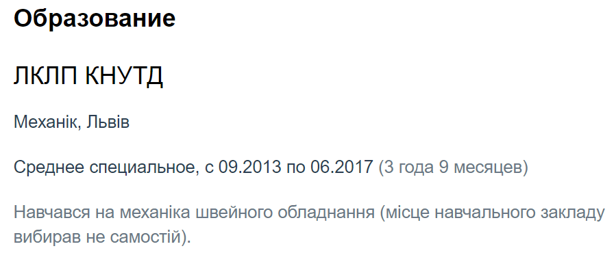 "Учился на механика швейного оборудования (место учебы выбирал не самостоятельно)", – пишет он.