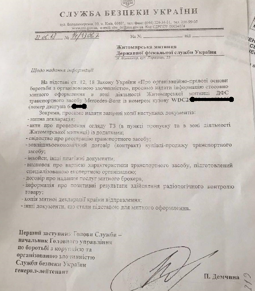 В запросе СБУ просит предоставить информацию об автомобиле Mercedes GLE 350D, который в 2017 году приобрела жена премьера - Елена Гройсман. В частности, таможенную декларацию, акты о проведении осмотра ТС, свидетельство о регистрации транспортного средства, инвойсы и другие платежные документы, договор о предоставлении услуг таможенного брокера и тому подобное.