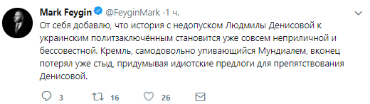 "Он тоже ее очень ждет. От себя добавлю, что история с недопуском Людмилы Денисовой к украинским политзаключенным становится уже совсем неприличной и бессовестной. Кремль, самодовольно упивающийся чемпионатом мира, вконец потерял уже стыд, придумывая идиотские поводы для препятствования Денисовой", - резюмировал Фейгин.