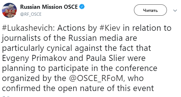 "Действия Киева в отношении журналистов российских СМИ выглядят особенно цинично на фоне того, что они намеревались принять участие в конференции, организованной ОБСЕ", - заявил Лукашевич.