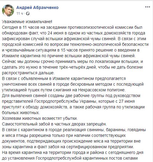 Об этом сообщил на своей странице в Facebook мэр города Андрей Абрамченко.