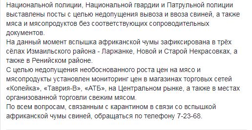 На данный момент вспышка африканской чумы зафиксирована также в трех селах Измаильского района - Ларжанке, Новой и Старой Некрасовках, а также в Ренийском районе.
