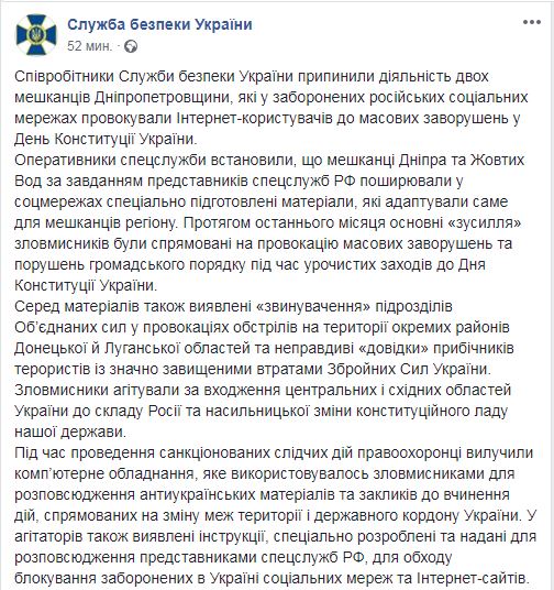"Установлено, что жители Днепра и Желтых Вод по заданию представителей спецслужб РФ распространяли в соцсетях материалы, в которых распространялись призывы к массовым беспорядкам и нарушениям общественного порядка во время торжественных мероприятий ко Дню Конституции Украины", - заявили в СБУ.