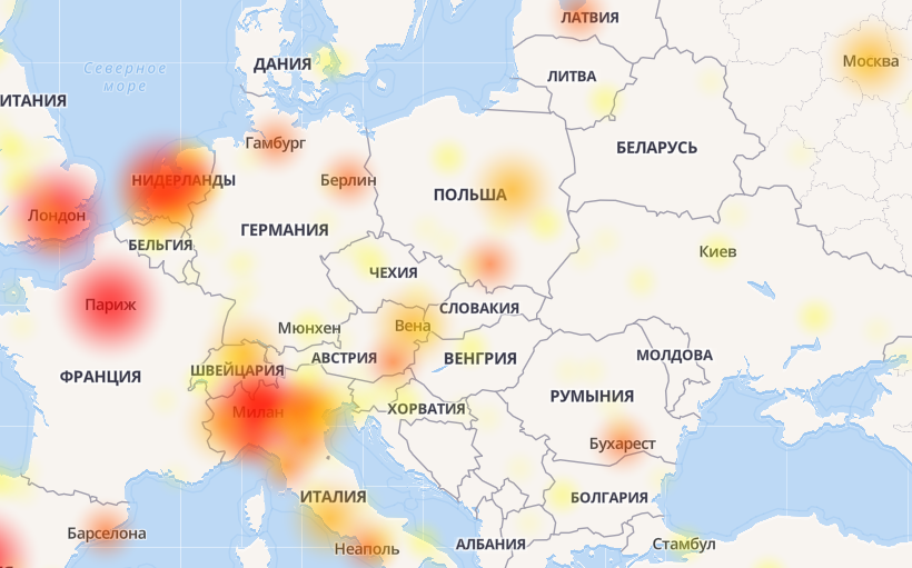 В списке стран, где были замечены помехи в работе, оказалась и Украина. Так, Киев отмечен красным.