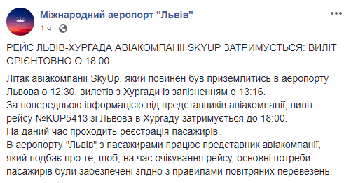 Поэтому вылет рейса №KUP5413 из Львова в Хургаду задерживается до 18:00, сообщила пресс-служба аэропорта, ссылаясь на информацию авиакомпании.