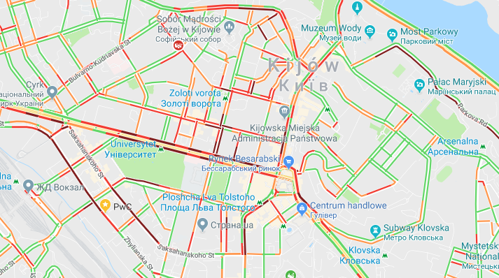 Так, стоит бульвар Шевченко, улицы Саксаганского, Жилянская, Симона Петлюры, Бассейная, Крещатик (в районе станции метро Театральная), Михайловская и Большая Житомирская и Вознесенская.