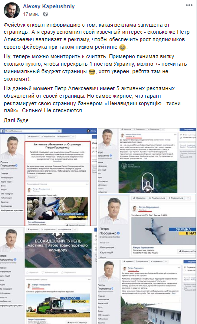 На данный момент Петр Алексеевич имеет 5 активных рекламных объявлений от своей страницы. Но самое жирное, что гарант рекламирует свою страницу баннером «Ненавидиш корупцію - тисни лайк». Сильно! Не стесняются", - написал журналист на своей странице в Facebook.