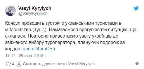 "Консул проводит встречу с украинскими туристами в городе Монастир (Тунис). Пытаемся урегулировать ситуацию", - сказано в сообщении.