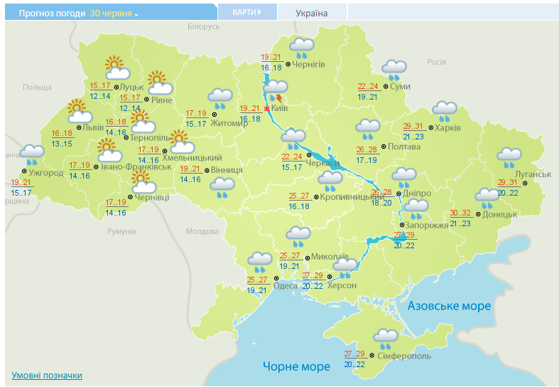 В ближайшие сутки, 30 июня, над Украиной сохранится влажная воздушная масса, а холодный воздух с северо-запада будет вытеснять жару на восток, сообщает Укргидрометцентр.