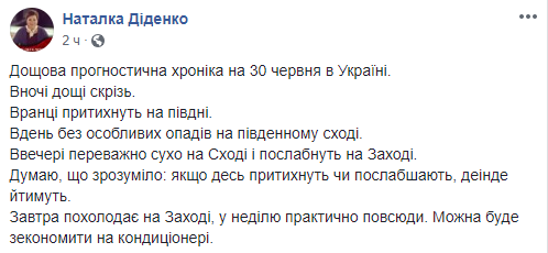 Синоптик Наталья Диденко рассказал, про дождевую прогностическую хронику на 30 июня в Украине.