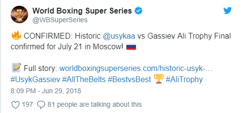 Руководство Всемирной боксёрской суперсерии (WBSS) официально подтвердило информацию о том, что финал турнира между украинцем Александром Усиком и россиянином Муратом Гассиевым пройдет в Москве на "Олимпийском" 21 июля.