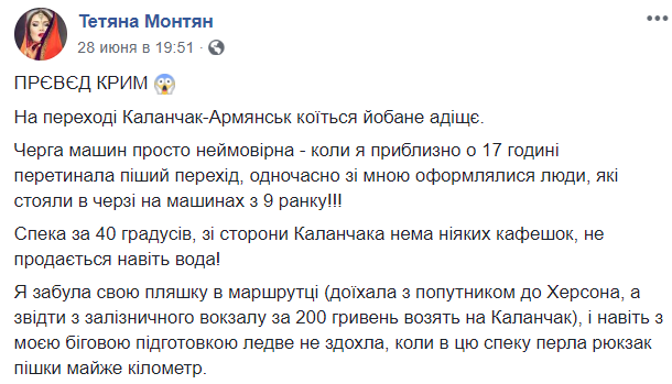 "Очередь из машин (на переходе Каланчак-Армянск - ред.) просто неимоверная - когда я приблизительно в 17 часов пересекала пеший переход, одновременно со мной оформлялись люди, которые стояли в очереди на машинах с 9 утра!", - пишет Монтян.