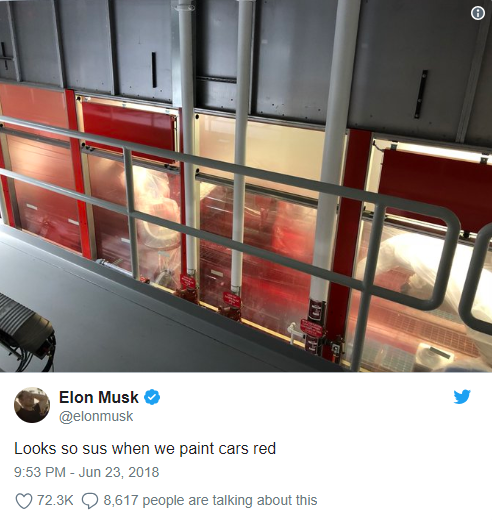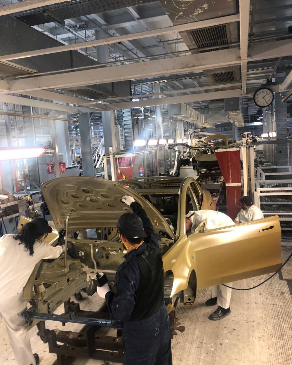 Маск показал мастерскую, где красят автомобили, и даже некоторые экземпляры Model 3 с двумя двигателями, выкрашенные в мастерской.