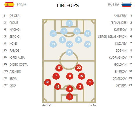 Испания: Де Хеа - защита Начо, Пике, Рамос, Альба - полузащита Коке, Бускетс, Силва, Иско, Асенсио - атака Коста
