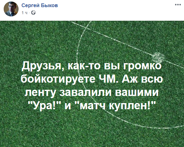 "Друзья, как-то вы громко бойкотируете ЧМ. Аж всю ленту завалили вашими "Ура!" и "матч куплен!"", - политолог Сергей Быков.