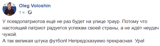 А так великая штука футбол! Непредсказуемо прекрасная. Ура!", - говорит политолог Олег Волошин.