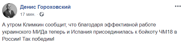 "А утром Климкин сообщит, что благодаря эффективной работе украинского МИДа теперь и Испания присоединилась к бойкоту ЧМ18 в России! Так победим!", - иронизирует блогер Денис Гороховский.