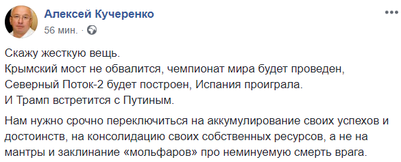 Нам нужно срочно переключиться на аккумулирование своих успехов и достоинств, на консолидацию своих собственных ресурсов, а не на мантры и заклинание "мольфаров" про неминуемую смерть врага", - говорит экс-министр ЖКХ Алексей Кучеренко.