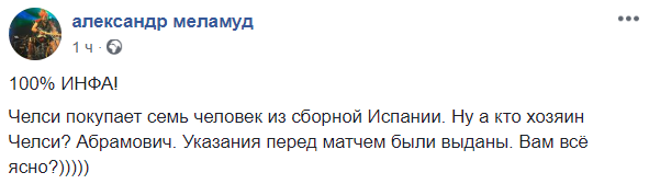 Бизнесмен Александр Меламуд поделился "инфой 100%", которая "объясняет" проигрыш сборной Испании: "Челси покупает семь человек из сборной Испании. Ну а кто хозяин Челси? Абрамович. Указания перед матчем были выданы. Вам всё ясно?".