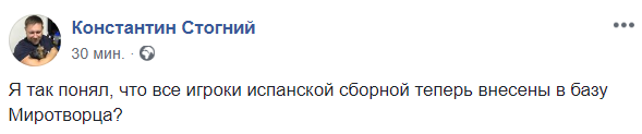 "Я так понял, что все игроки испанской сборной теперь внесены в базу Миротворца?", - спрашивает телеведущий Константин Стогний.