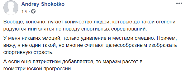 "Вообще, конечно, пугает количество людей, которые до такой степени радуются или злятся по поводу спортивных соревнований.