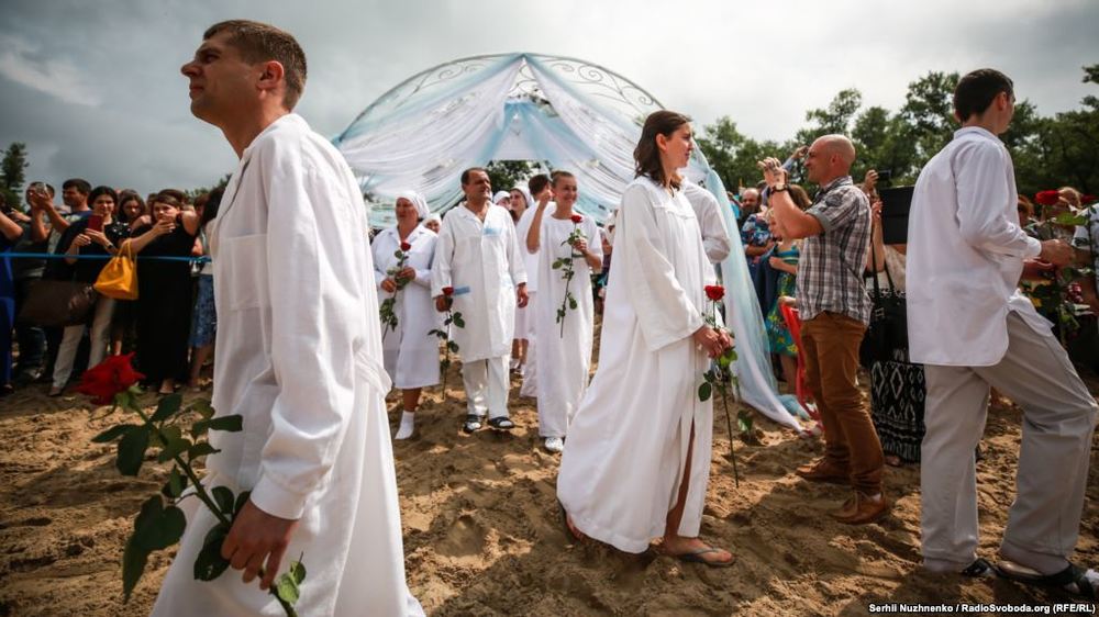 В Киеве на Трухановом острове массово крестили баптистов в белых одеждах. Фото