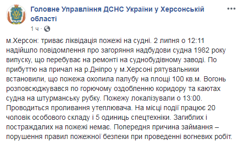 "По прибытию на причал Днепра в Херсоне спасатели установили, что пожар охватил палубу на площади 100 кв. м. Огонь распространялся по горючей отделке коридора и каютах судна на штурманскую рубку. Пожар локализован в 13:00", - говорится в опубликованном сообщении.