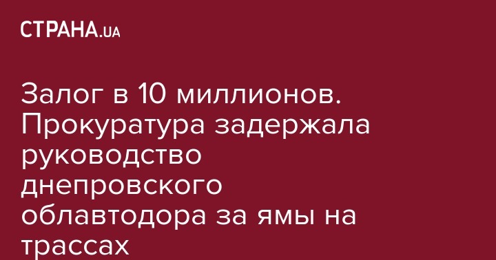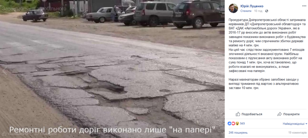 "Прокуратура Днепропетровской области задержала руководителей ДП "Днепропетровский облавтодор" и ОАО "ГАК "Автомобильные дороги Украины", которые в 2016-17 гг. вносили в акты выполненных работ завышенные показатели выполненных работ по строительству и ремонту дорог, чем нанесли убытки государству почти на 4 млн гривен", - написал генпрокурор.