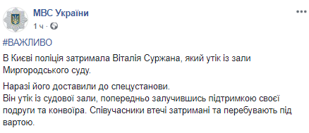 "В Киеве полиция задержала Виталия Суржана, который сбежал из зала Миргородского суда. Сейчас его доставили в спецучреждение", - говорится в сообщении.