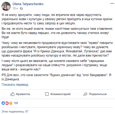 Его комментарий появился под украиноязычным постом переселенки из Донбасса Елены Татьянченко, которая высказала свое негодование в адрес переселенцев с Донбасса и Крыма, которые говорят на русском языке.