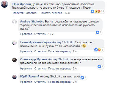 Любопытно, что на уточняющий вопрос пользователя Андрея Шокотко о том, действительно ли Юрий Яровой, находясь на госслужбе, позволяет себе публично называть русскоязычных граждан "дебильноватыми", чиновник ответил, что Шокотко и сам относится к этой категории.
