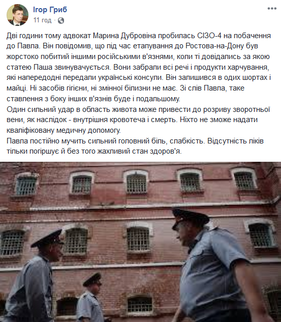 "Адвокат Марина Дубровина пробилась в СИЗО-4 на свидание к Павлу. Он сообщил, что во время этапирования в Ростов-на-Дону был жестоко избит другими российскими заключенными, когда те узнали по какой статье Паша обвиняется. Они забрали все вещи и продукты, которые накануне ему передали украинские консулы. Он остался в одих шортах и ​​майке. Ни средств гигиены, ни сменного белья нет. По словам Павла, такое отношение со стороны других заключенных будет и дальнейшем.