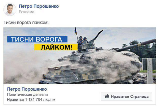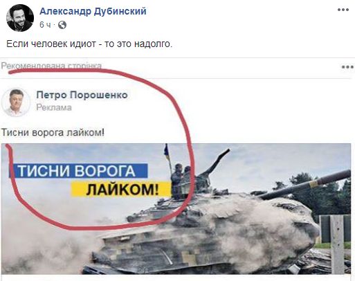 Особое внимание пользователей привлекла публикация с картинкой, на которой изображен украинский танк, а поверх наложена надпись "Жми врага лайком!"